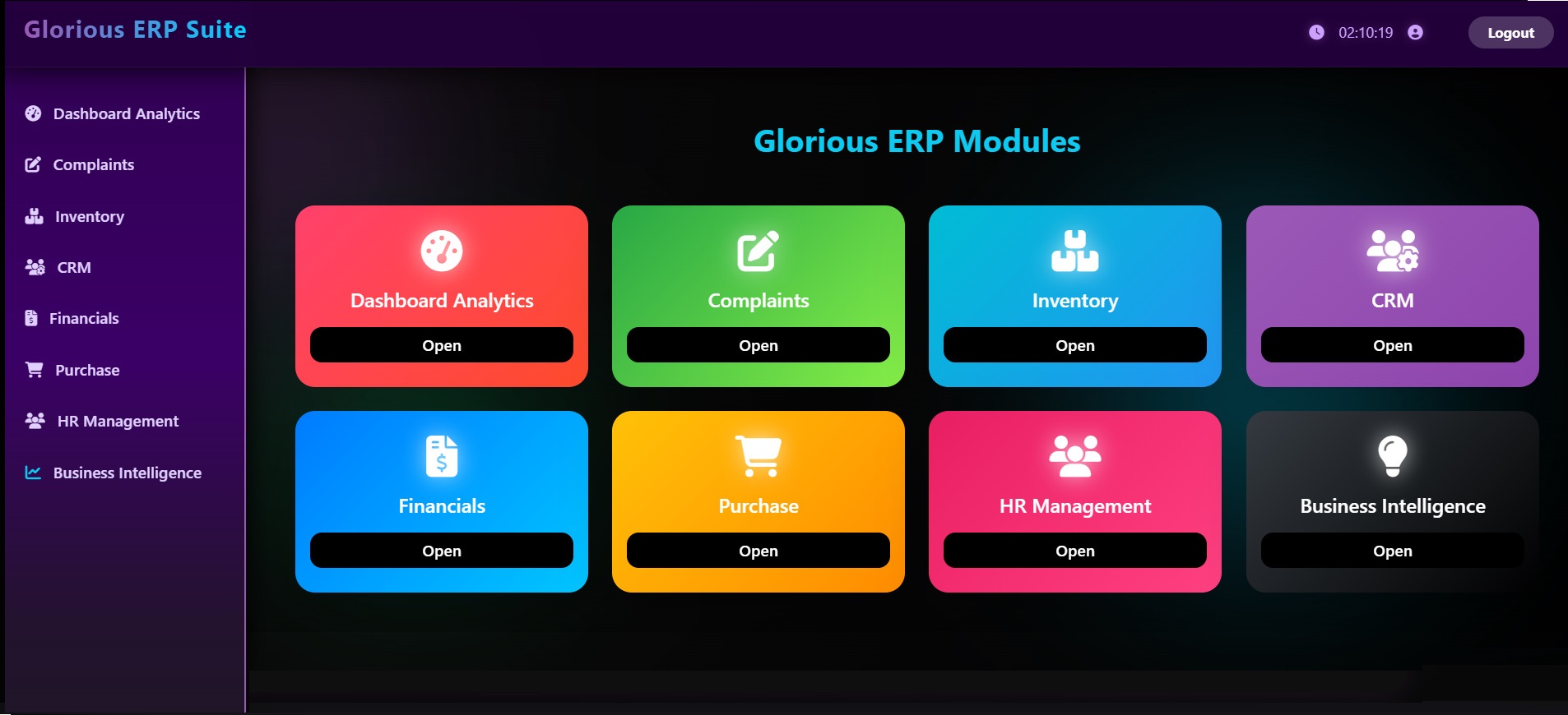 Comprehensive ERP suite integrating Dashboard Analytics, Finance, Inventory, Procurement, Complaint Management, CRM, HR and Business Intelligence for total business control.